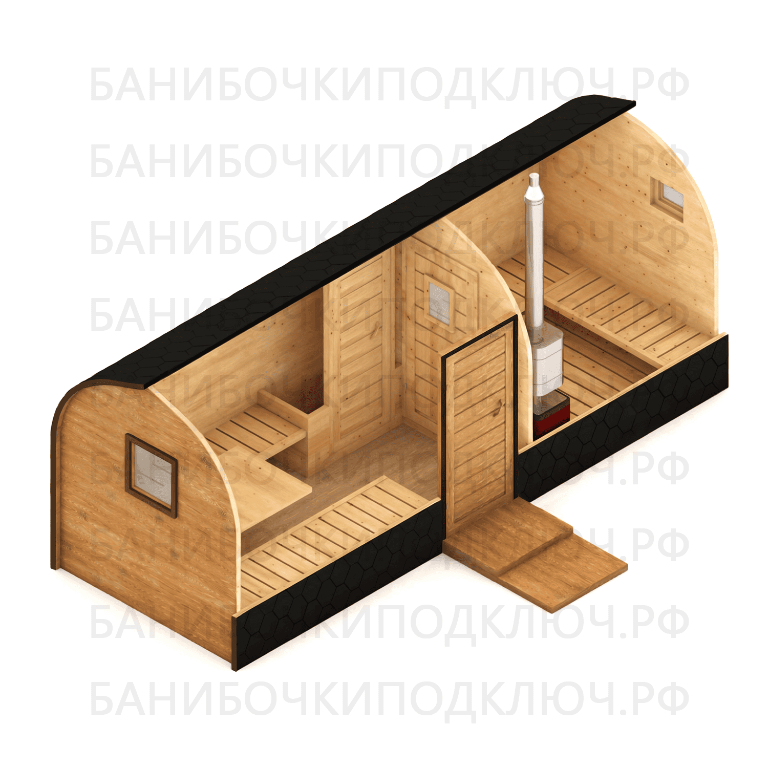 Баня Викинг 6 x 2,2 м с арочным входом и проходной мойкой